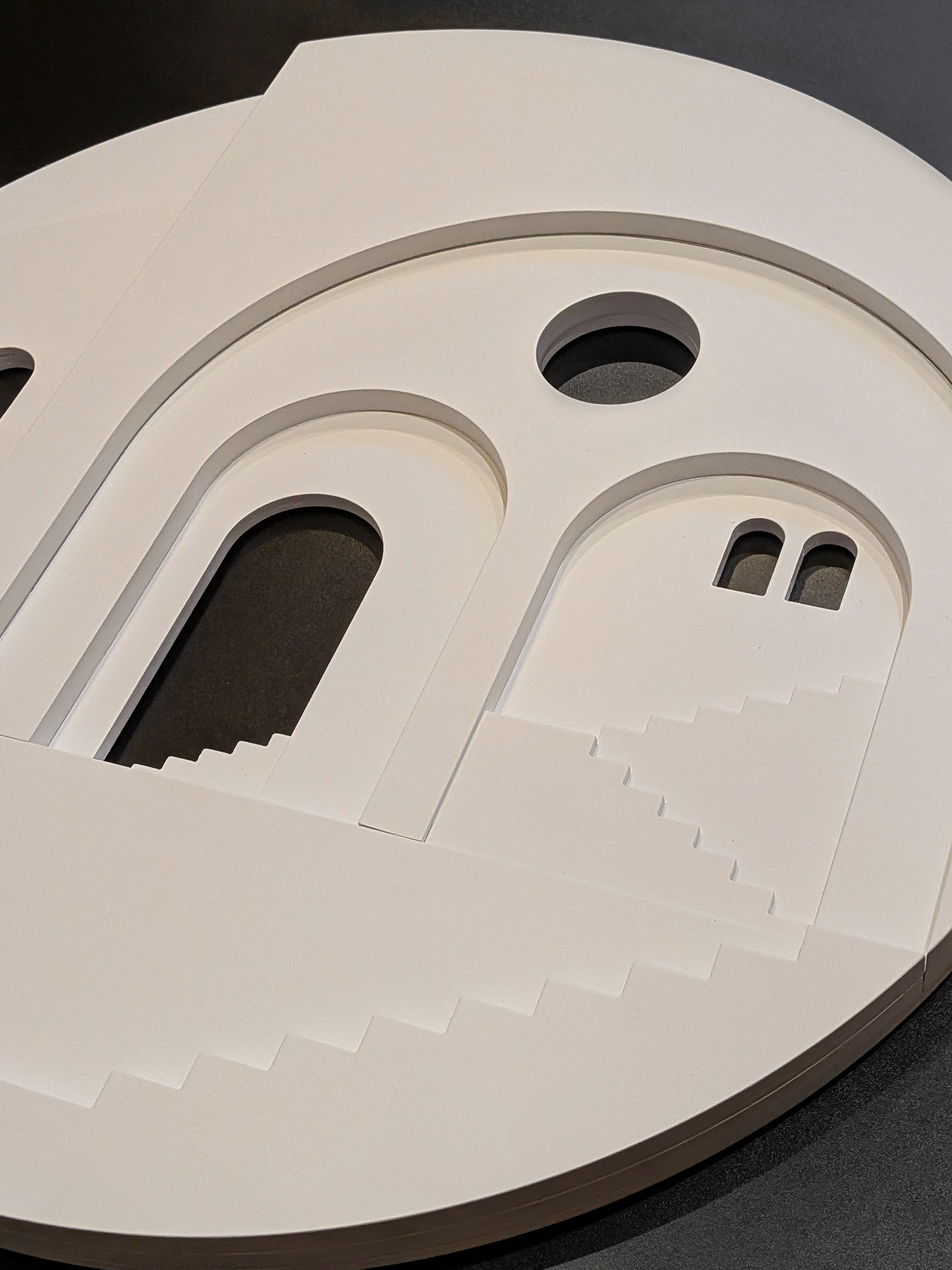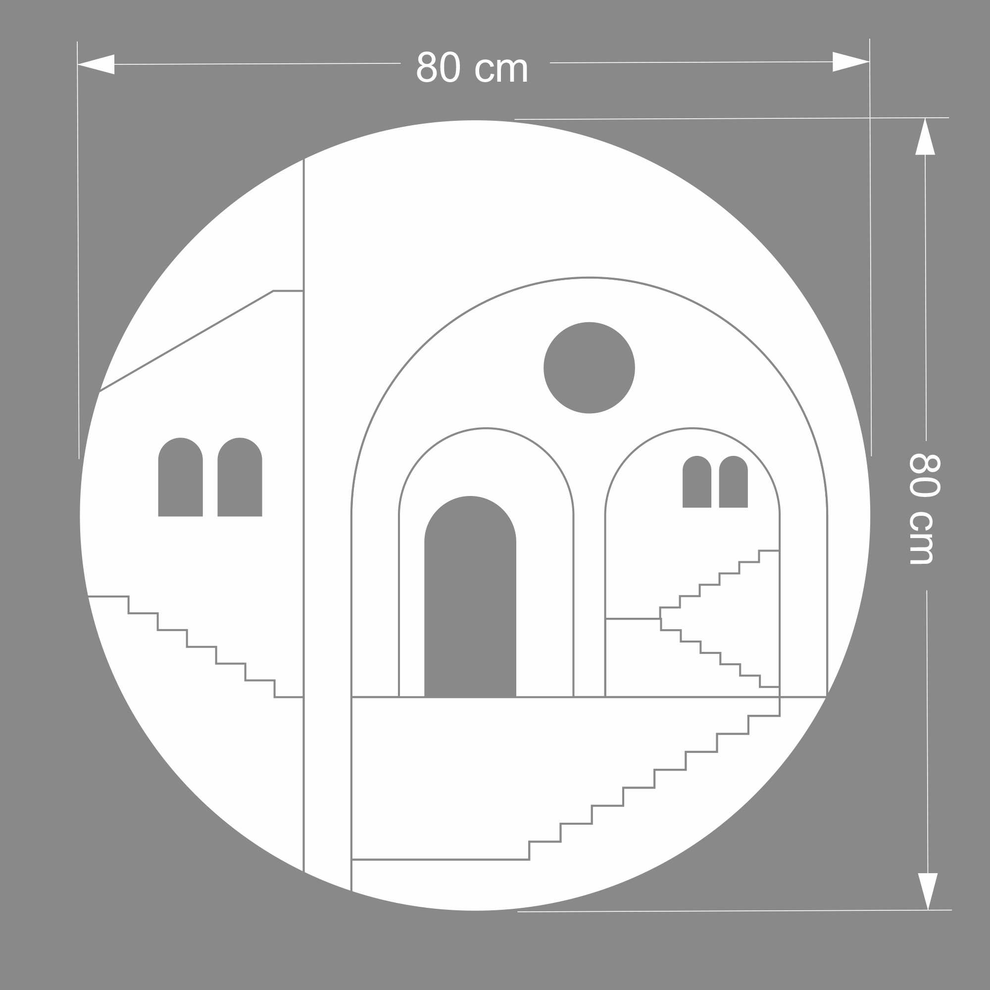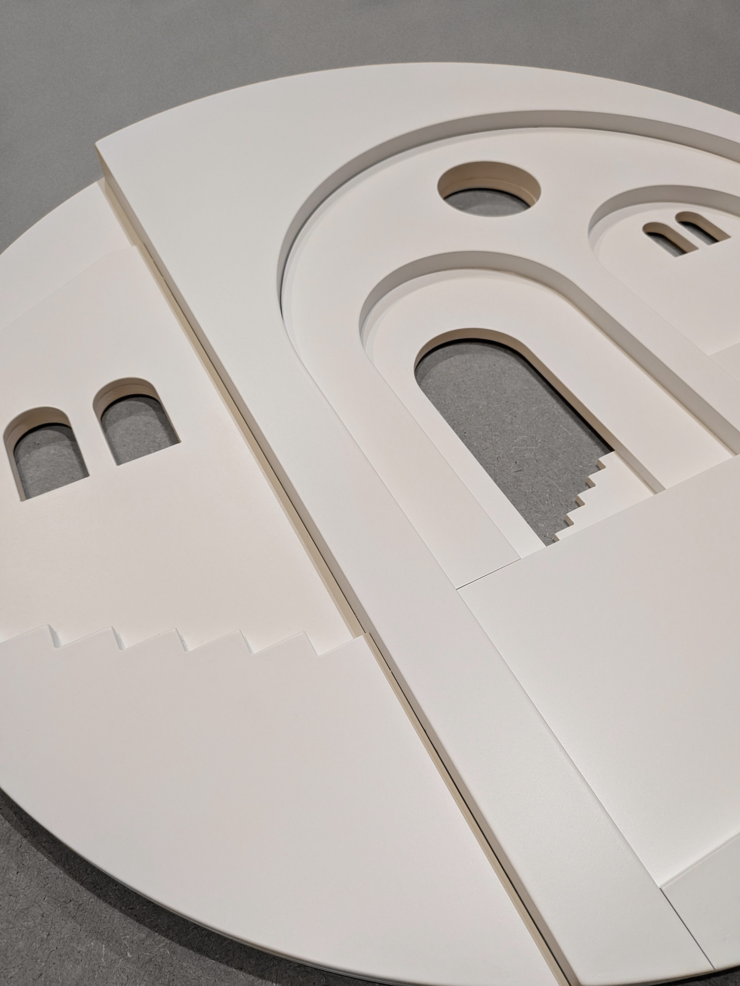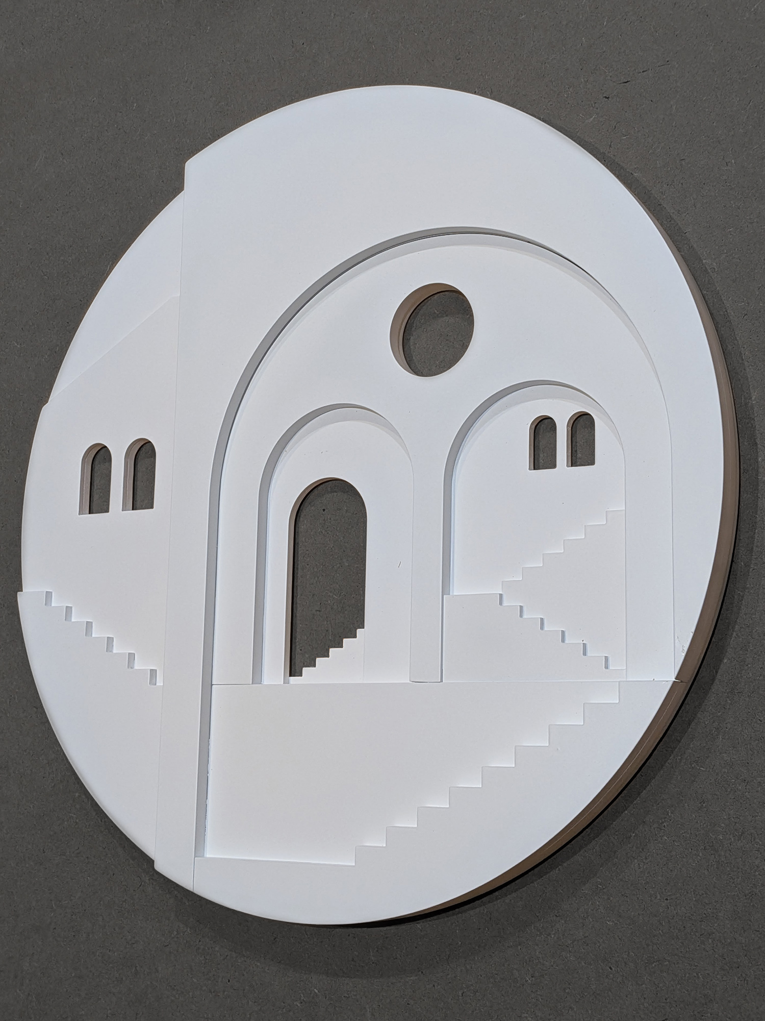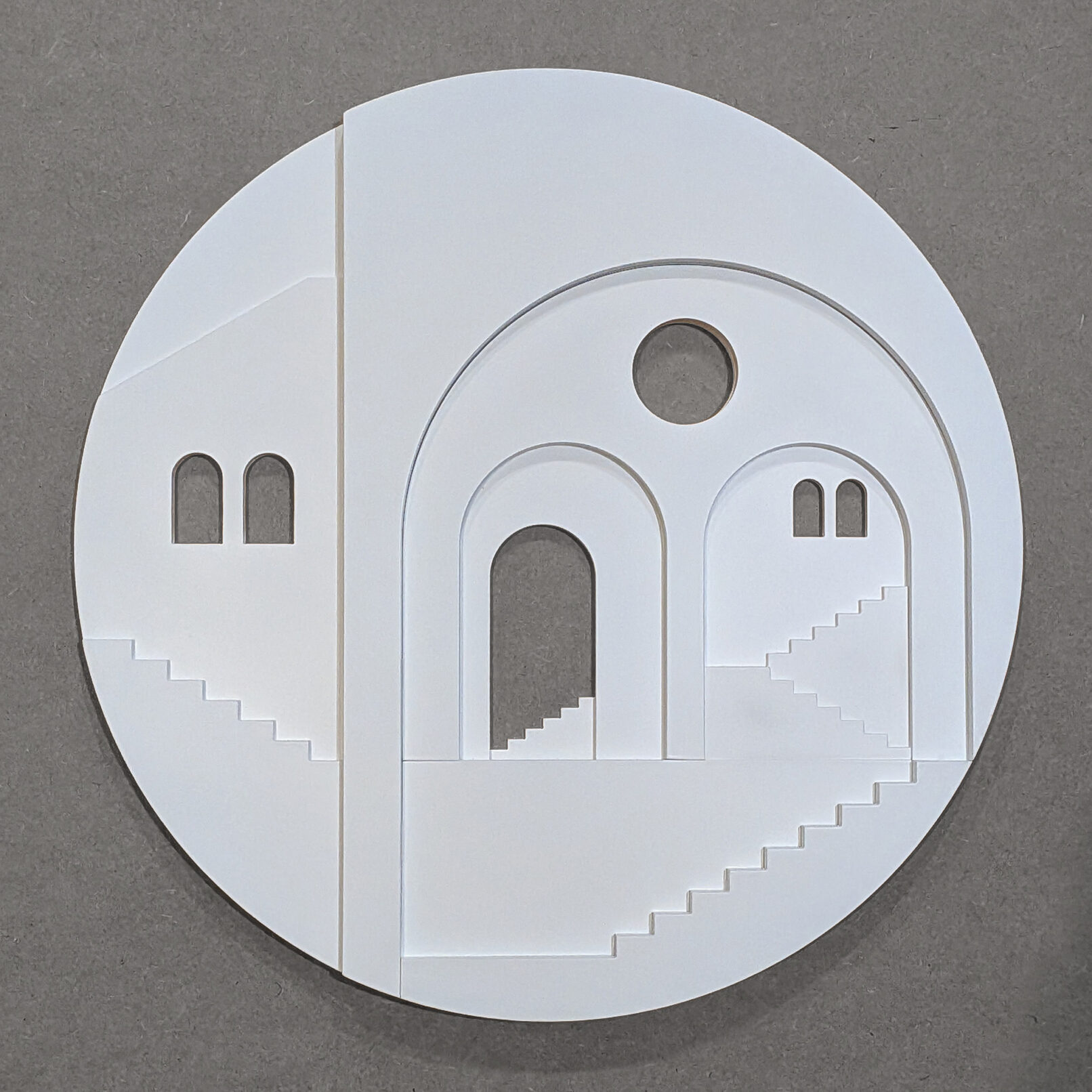 In the third and final Pueblo series, architectural elements are composed within circular forms, arranged in a collage-like manner that introduces a new spatial dimension. These works move beyond individual buildings to explore the broader emotional landscape of shared spaces — reflecting on how architecture, geometry, and proportion shape our sense of community and belonging.